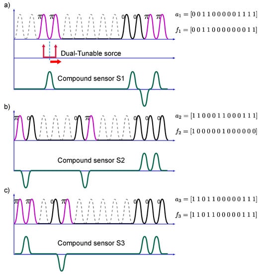 A set of three amplitude and phase codewords is selected as exemplified in Table 1; these codewords are interpreted in increasing wavelength as described in Equation (1) and have a bit length of 13 positions, meaning that each SSFBG device features 13 slots to allocate the respective reflection sub-bands according to the codewords . However, due to the dual-wavelength interrogation principle, the retrieved information from each sensor consists of 12 sub-bands. For example, the first sensor (S1) is constructed by the codewords in amplitude, and in phase. Hence, it is composed of six sub-bands corresponding to the 1’s in the amplitude codeword . In turn, the phase value for each sub-band is determined by the codeword , that enables the factor at the nonzero bit positions. Figure 2a–c depicts the equivalent sub-band distribution for the set of sensors in Table 1, as well as their compound interrogated signal. A change of phase between consecutive sub-bands is translated to a negative sign in the detected shape, likewise, two adjacent sub-bands without a phase change produce a detected signal with positive sign.