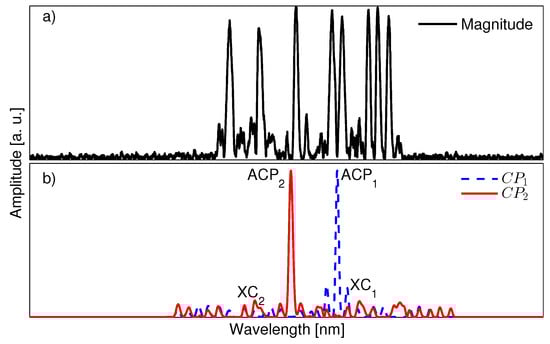 where the correlation product is computed for each sensor over the wavelength operational range . The maximum point, known as the auto-correlation peak (ACP), occurs at the wavelength where the individual sensor and the compounded measurement coincide. Therefore, it indicates the central Bragg wavelength for each sensor (see Figure 4 for illustration). The residual lower values constitute the cross-correlation signal (XC), which is constrained to a low value. This means that the sensor expected response does not match with the measured spectrum at those specific wavelength values. In Figure 4a, the magnitude component of the retrieved frequency response for a set of two sensors is shown. Figure 4b shows the corresponding ACP and XC values for the two sensors encoded in the compounded measurement.