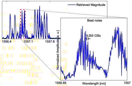 Terms in Equation (8) represent the interaction between the dual-wavelength source and the sensing network for two generic wavelengths and . We can conclude that direct terms, in Equation (8a,b), are present at the frequency , and are affected by the phase of a unique sensing device. On the other hand, while cross terms, , are present at the same frequency and affected by the phase component of the different sensors (). They have two additional terms causing a phase delay: () is the phase noise inherent to the laser source, and () describes the interferometric phenomenon caused by the cavity formed between two overlapping sub-bands. The effect of these terms on the sensors measurement is addressed in the next section.
