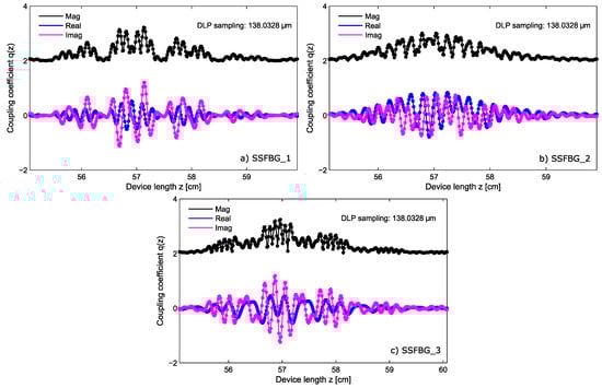 Complex coupling coefficient , for the three designed SSFBG sensing devices. The magnitude as well as the real and imaginary components for each sensing device are shown in (a–c). The amplitude of the coupling coefficient is proportional to the index profile of the grating.