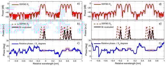 Design for the super-structured sensor and . (a,d) Represents the magnitude spectrum in dB for the first and third designed sensor; (b,e) the linear representation of the magnitude spectrum and their bi-evaluated shape; and (c,f) the relative phase of the devices , , i.e., the phase relationship between consecutive sub-bands of the device.