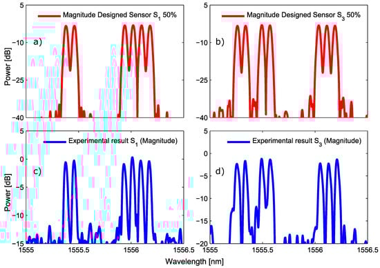 The measured magnitude of the manufactured SSFBG is depicted in (c,d) for the devices and . The designed magnitude of this sensors is shown in (a,b) for comparison.