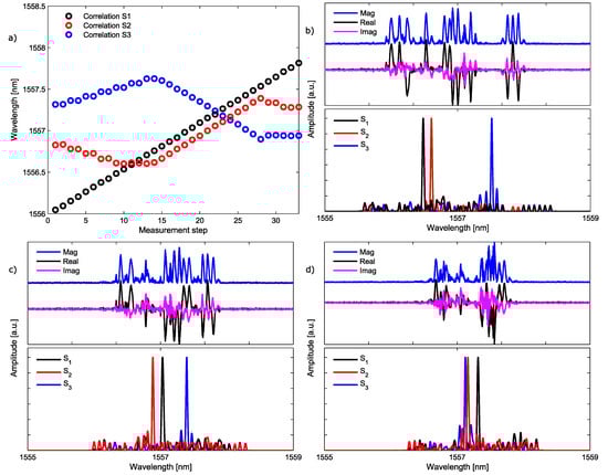 Each sensor’s central wavelength is depicted for the whole overlapping scenario between the three sensors in (a). (b–d) Three intermediate captures of the system; the upper plot depicts the sensing network readout (magnitude, real and imaginary components) while the lower plot presents the retrieved central wavelength obtained for each sensor after running the correlation algorithm. Magnitude representations have an offset in order to facilitate the visualization.