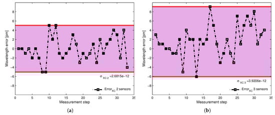 Hence, the individual wavelength was measured for the sensing device ; this measured wavelength was then contrasted against its measured wavelength in presence of sensor and finally against its wavelength when sensors and where sharing the spectral region. The point by point difference between the individual measured wavelength and the wavelength obtained in presence of an additional sensor is depicted in Figure 10a. Figure 10b shows the point-by-point difference when two additional sensors are interacting with the individual sensor. The standard deviation due to the cross-correlation between two sensors is pm, and due to the interaction between three sensors, pm.