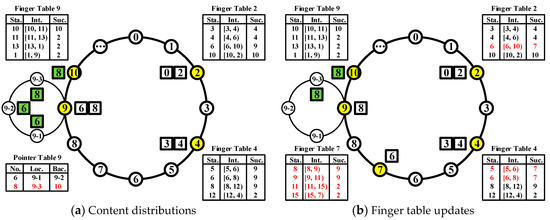 A schematic circle of SCC is constructed in Figure 1a. For simplification, the term “content” (“cluster”) will refer to both the original content (IoT cluster) and content (cluster) identifier under the hash function. The distinction is easy to find based on context. Each cluster should maintain a constant identifier which is hashed from the information of cluster leader, cluster member, or other related components. It should not be changed until the last member has left the network. The cluster leader can represent the whole cluster and mark itself with the cluster identifier. Assuming m is equal to 4, there will be 16 empty slots (characterized by the circles with white) for both clusters and contents. The position of slots is not proportionally spaced to better illustrate the main part. Four existing clusters represented by their cluster leaders (marked by the circles with yellow) are 2, 4, 9 and 10, respectively. The cluster members (characterized by the thin circles with white), i.e., 9-1, 9-2 and 9-3, should have a direct connection with cluster leader 9. The circle linked them is not another Chord circle. The identifiers of cluster members are just the extensions of cluster leaders, which means it is only visible inside cluster by the local members. The six content (marked by the squares with white) are 0, 2, 3, 4, 6 and 8, respectively. Three finger tables for cluster 2, 4 and 9 are given to locate the cluster that is in charge of the content. The content 6 and 8 (marked by the squares with green) are cached in 9-1, 9-2, 9-3 and 10 due to the limited capacity of cluster leader 9. It is suggested that the backup content of a cluster leader should be stored in its successors. They could be easily found even if this cluster is disappeared. A pointer table of cluster leader 9 is also given to identify the mapping between the content and its location.