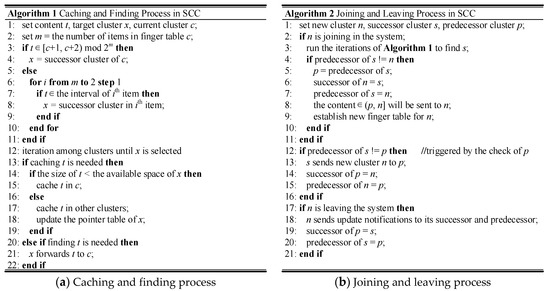 Assuming cluster 7 wants to leave the system, the necessary procedures are quite similar with that of joining. When cluster 9 receives an update notification from cluster 7, it will change the predecessor from cluster 7 to cluster 4. The relevant content (i.e., content 6) should be sent back to cluster 9 as well. Cluster 7 may send an update notification to cluster 4 to trigger a quick change of the successor. However, even these actions are not executed by cluster 7, the performance of the whole system will not be affected seriously. Due to the success of its applications, more and more recent papers [57,58] are presented to enhance this protocol. We believe all these works are also beneficial for SCC. The relevant pseudocode is illustrated in Figure 2b.