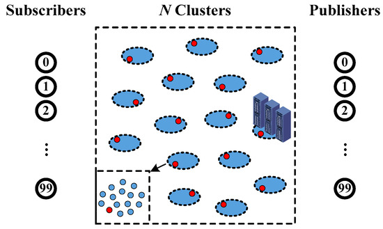 A topology (shown in Figure 3) is carefully built to compare and analyze the overall performance of different schemes. Multiple IoT nodes are gathered to form a cluster, which is the basic element of fog computing. A cluster is composed of a leader (marked by the circles with red) and a group of members (marked by the circles with blue). The enlarged view of a cluster is illustrated at the bottom left corner. There are totally N clusters (located in the center area), 100 subscribers and 100 publishers (located at the left and right sides, respectively) in the network. The clusters are numbered from 1 to N, according to the distance between the cluster and subscriber (N means the farthest cluster). A rendezvous server with aggregation function belongs to one cluster that is near to the publishers. Let us assume that each cluster has caching ability to store a complete packet and one message will not be separated into multiple packets. The period interval of requests is stable.