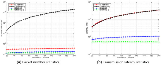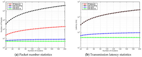 In Figure 4a, the packet number statistics for different schemes are illustrated. The horizontal axis is set to the number of clusters in the network. To better highlight the difference, we adopt logarithm for vertical axis display. The curve with black (at the top of the figure) demonstrate the packet number in ICN Flooding scheme. Although content caching is enabled in all clusters, plenty of unnecessary packets are still generated and forwarded inside whole network. It is significant to design an appropriate policy even ICN is adopted in IoT scenarios. The curves with red and blue (at the middle area of the figure) represent the IP Network and ICN SCC, respectively. As we expected, with the increasing of network scale (in terms of cluster number), the traffic volume of traditional IP network is getting bigger. The growth rate in this scheme is not as high as that of ICN Flooding. However, it still brings some additional burdens for the clusters. For ICN SCC scheme, the caching cost and searching efficiency are properly balanced. The growth rate of packet number is obviously controlled. The curve with green (at the bottom of the figure) shows that the fluctuation of ICN SCC-E is always stable. It proves that one hop searching is effective in SCC and the clusters can find the content with limited cost.