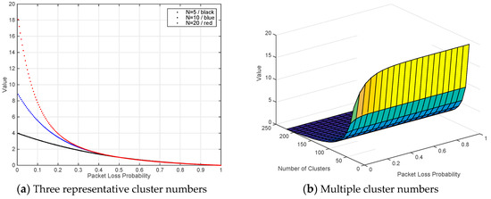 To further explore the relationship between p, N and packet number, we draw two analytical figures in Matlab. Figure 5a illustrates the results of three representative N (5, 10 and 20 are represented with black, blue and red, respectively). With the increasing of packet loss probability (from 0 to 1), all curves are getting down. The critical value appears when p is around 0.5, i.e., the value of polynomial will approach 1. Since more values of N will lead to serious overlaps, we only reserve three curves in Figure 5a. More details are demonstrated in Figure 5b from the three-dimensional perspective. It also proves that 0 < p < 0.5 is a reasonable selection for scenario two.