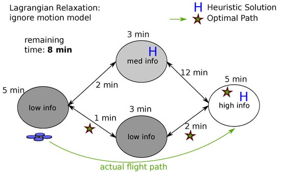 For completeness we now describe the iterative greedy heuristic developed for multipass search in previous work []. Relax the problem formulation in (Equation (3)) by permitting sequences of actions that are not feasible. In other words, regardless of the agent’s current state, the agent must select L discrete actions to take, from all actions that are available from any state (Note that to guarantee admissibility is the sum of all actions that transition between regions and all actions that search a given region, Section 3.1).