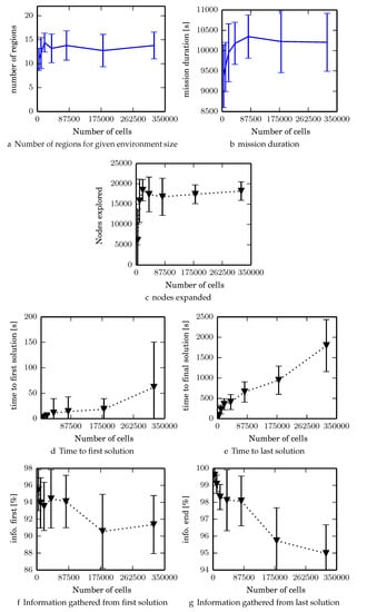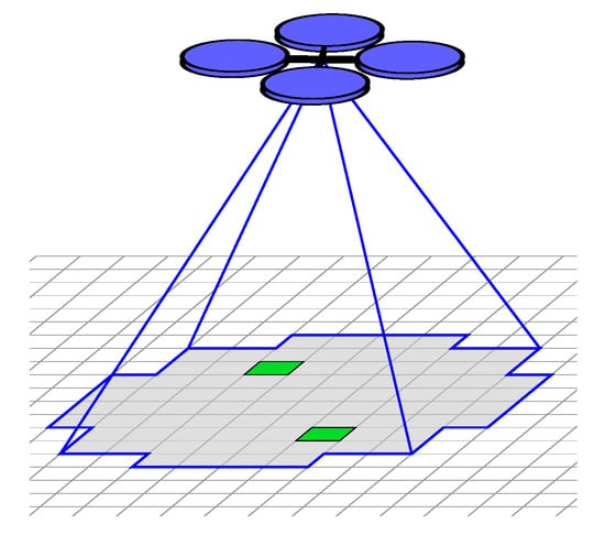 Further, whether or not targets are stationary or dynamic affects the search. If targets are known to be stationary (or static), one could divide the search space into cells on a grid and track hypotheses in each cell [,,]. Or, one can track the number of targets contained within each cell [,]. Since our work assumes stationary targets, there is a grid of cells, but the approach collects multiple cells into regions for faster evaluation of coverage plans by planning at the coarser granularity of searching regions instead of cells, requiring fewer actions for a full duration coverage plan at the cost of generating suboptimal plans. Targets that react and move according to the agent’s position can be assumed to have an adversarial relationship characterized by pursuit-evasion games []. Alternatively, target motion can be modeled as a Markov process which is unaffected by the agent’s actions [,,]. Certain approaches also factor coordination between agents to find the target(s), either implicitly or explicitly []. Regarding multiagent algorithms, in particular explicit coordination methods are exponentially complex with the number of agents []. Multiagent coordination where the agents share and fuse observed data is common [,,,,,]. Multiagent search can also be adversarial where two competing teams are searching for the same target [].