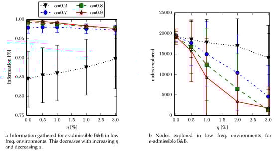 The greedy heuristic algorithm is able to find higher quality solutions than DF-B&B but not DFS or -admissible B&B. The greedy heuristic algorithm is also slower than DFS. The poor solution quality of DF-B&B despite the long time to compute the solution highlights the importance of generating effective heuristics to guide branch and bound to find high quality solutions. This is a finding that is not always recognized in the literature (usage of DF-B&B in place of heuristic guided B&B has occurred []). Note that DF-B&B is actually guaranteed to find optimal solutions when run to completion but is unable to find high quality solutions in a reasonable amount of time.