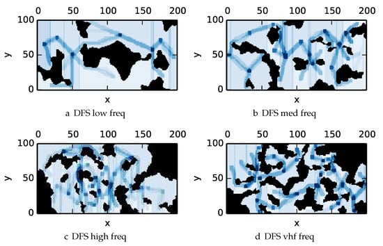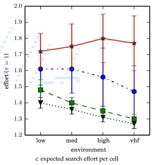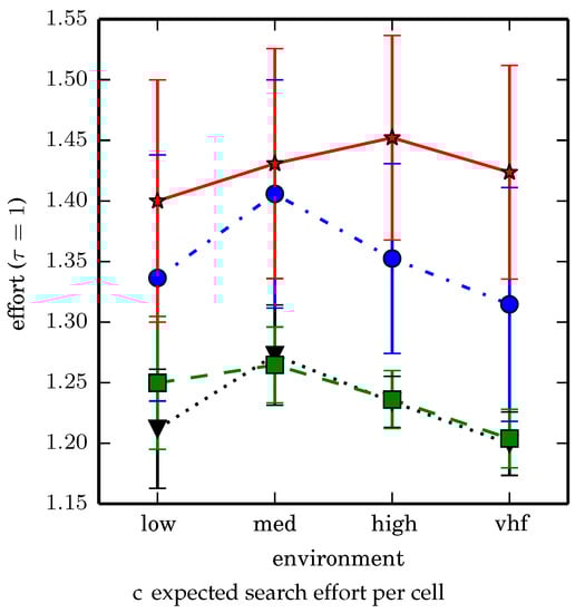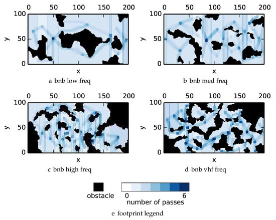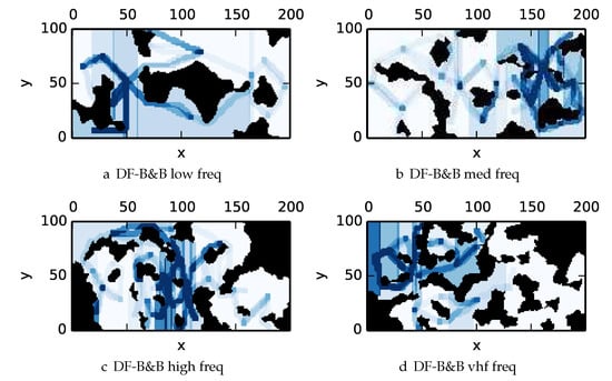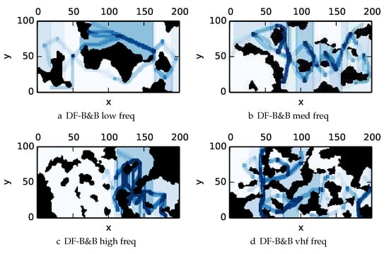One can observe that branch and bound covers the environment most uniformly (resulting in the highest quality solution) while the greedy solver can get stuck or miss regions. DFS’s performance falls in between -admissible B&B and the greedy heuristic solver while DF-B&B has the worst performance. Results are summarized on the uniform environments in Table 2 and on the nonuniform environments in Table 3. denotes the number of solution improvements found during the search. The described effort allocation model computes the expected time to search a cell in number of time constants (e.g., with ), denoted as “effort” on Table 2 for the uniform environment using detection threshold . Figure 20 and Figure 21 summarize key results in Table 2 and Table 3 respectively.