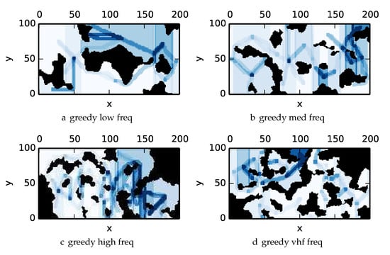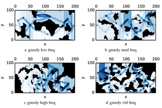 The strategy to find the optimal solution is to sort all actions based on the incremental reward. While picking one action may affect the reward of other actions, those actions affected are a small subset of all actions and can be recomputed, since information content is localized to a given cell, and the information in cells may be accessed by different actions. During each round the action with the most reward is selected; by the concavity of the reward function the reward for taking an action a the ith time is collected before taking action a the th time []. An illustration of how the iterative greedy heuristic works in practice can be found in Figure 3.
