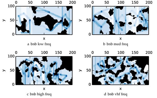 For comparison of results between algorithms, we define a simplified search effort allocation model to see how effective the various multipass coverage planning algorithms are at directing rescue teams. This simplified model can study the practical consequences of having informative trajectories for search and rescue but ignores effects due to finite search resources/time, survivor survival rates, and the time spent transitioning between cells. The search effort allocation model is distinct from the sensor model used by the planner based on the different attributes or roles the autonomous agent and human ground crews have during the search and rescue operation. We assume that after executing the autonomous search using one of the benchmark algorithms outlined in Section 4.1, the agents generate an occupancy map which become prior probabilities for the human rescue teams on the ground. Let D be the event that the target is detected within a given cell, while is the absence of detection. X is the presence or absence of a target in the cell as in the previous model (Equation (1)). is the detection time constant effectively rescaling the given search time to search effort. Define the probability of detection of a target in a given cell (Equation (8)) [,]: