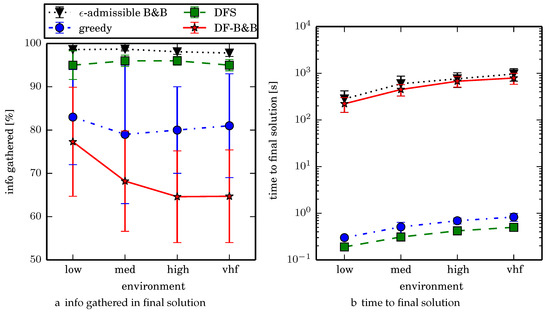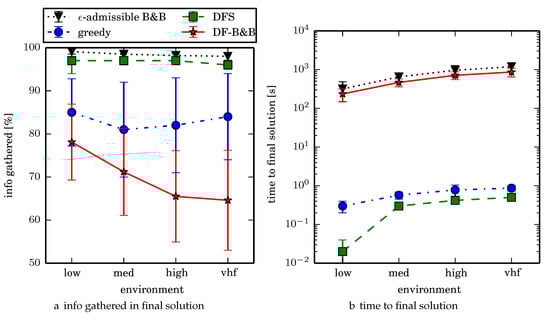 Comparing the two algorithms that gather the most information on average, -admissible B&B gathers 2.3% more information on average than DFS search taking 1–2 orders of magnitude longer to compute. To get a better sense of the real world performance improvement, -admissible B&B searches uniform environment at a rate that is 2.8% faster than the DFS coverage planner (where the search rate is inversely proportional to time to search a given cell), while -admissible B&B searches nonuniform environments at a rate that is 0.8% faster than DFS. We think that this decreased performance improvement in the nonuniform environments is a limitation of the Boustrophedon decomposition algorithm and/or the region coverage planner. Generating region coverage plans that factor in the information content by non-uniformly covering regions, or a polygonal decomposition that factors in information content (consider an extension of the weighted Voronoi Diagram that accounts for obstacles) would alleviate this and allow -admissible B&B to better reason about nonuniform distributions of information. When dealing with computational time budget constraints (fixed time budget for computing resources), we observe that -admissible B&B is an anytime algorithm. In the vhf uniform environments for example, around 90% of the time the first solution is discovered within 4.5 min (in contrast with about 90% of the trials terminating around 24 min).