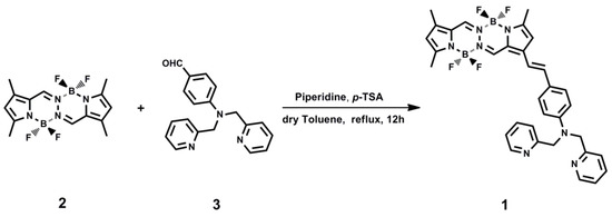 Compound 2 [30] and 3 [29] were synthesized according to literatures, while 1 was synthesized as illustrated in Figure 1. Dry toluene used in synthesis was distilled over sodium and benzophenone. A mixture of 2 (0.50 g, 1.48 mmol), 3 (0.45 g, 1.48 mmol), and p-toluenesulfonicacid (1 g, 5.81 mmol) was dissolved in dry toluene (50 mL), followed by the addition of 1 mL piperidine as catalyst. The mixture was refluxed with stirring for 12 h under an atmosphere of nitrogen, during which time the color of the reaction mixture changed from pale yellow to red. After cooling to room temperature, the mixture was poured into H2O (100 mL) and extracted with CH2Cl2. After solvent removal, the crude product was purified by column chromatography (silica gel, CH2Cl2/petroleum ether, v/v = 2/1), producing a dark purple solid (0.45 g), yield 49%. 1H-NMR (400 MHz, DMSO-d6) δ = 8.61–8.60 (m, 2H), 7.92 (s, 1H), 7.84 (s, 1H), 7.65–7.62 (m, 2H), 7.38 (d, J = 5.6 Hz, 2H), 7.25 (d, J = 5.2 Hz, J = 5.2 Hz, 2H), 7.20–7.18 (m, 2H), 7.17 (d, J = 2.8 Hz, 2H), 6.72 (d, J = 6.0 Hz, 2H), 6.68 (s, 1H), 6.16 (s, 1H), 4.87 (s, 4H), 2.48 (s, 3H), 2.32 (s, 3H), 2.31 (s, 3H). (Figure S1, Supplementary Materials). 13C-NMR (100 MHz, DMSO-d6) δ = 157.67, 150.75, 150.07, 149.40, 148.72, 140.24, 139.84, 136.69, 136.49, 133.39, 132.27, 128.63, 124.96, 124.08, 122.98, 121.81, 120.34, 117.88, 114.17, 113.24, 112.24, 56.83, 13.66, 10.73, 10.65. (Figure S2, Supplementary Materials). MALDI-TOFMS: m/z calculated for C33H31B2F4N7: 623.28; found: 623.47. (Figure S3, Supplementary Materials).