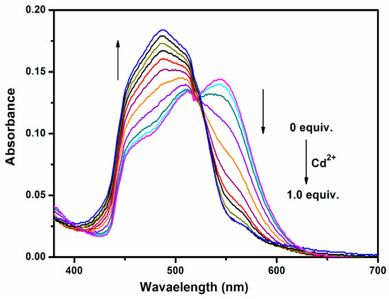 UV-vis absorption spectral change recorded for an acetonitrile solution of sensor 1 (2 μM) upon the titration of Cd2+ ion.