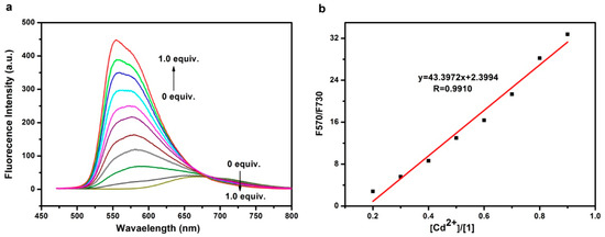 (a) Fluorescence spectral change recorded for an acetonitrile solution of sensor 1 (2 μM) upon titration of Cd2+ ion; (b) The ratio of fluorescence intensity (F570/F730) measured for the same solutions at 570 nm and 730 nm as a function of the concentration of Cd2+ (relative to that of 1), showing linear fitting as indicated in the plot.