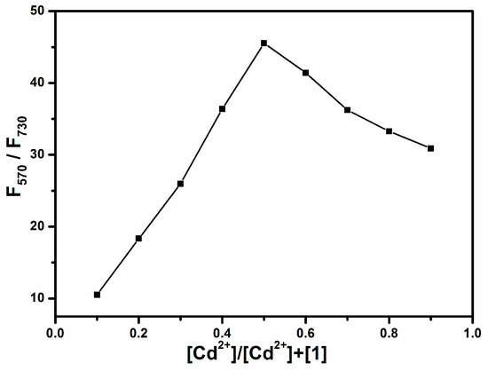 As illustrated in Scheme 2, the sensing mechanism of 1 relies on switching the fluorescence from ICT transition to local π − π transition at the BOPHY site. The BPA chelator affords strong binding to the Cd2+ ion, and this weakens the electron donating power of the aniline moiety, thus diminishing the ICT transition. The tridentate chelation of BPA forms 1:1 complex with Cd2+ ion, as also reported in other studies wherein the same chelator was used [29]. The 1:1 chelation stoichiometry was also confirmed in this study through a Job’s plot approach [44], as shown in Figure 4. Job’s plot is commonly used to determine the stoichiometry of a complex between two species, for which the total molar concentrations of the two species (here molecule 1 and Cd2+ ion) are kept constant, while their relative concentrations are varied. A measured variable (here the fluorescence intensity ratio, F570/F730) that is dependent on the complex formation can be plotted as a function of the molar fractions of the binding species. The maximum of the plot corresponds to the stoichiometry of the complex formed. In this study, the total concentration of molecule 1 and Cd2+ ion was fixed at 2 μM, and the molar ratio of the two species was changed from 1:9 to 9:1, and the fluorescence intensity ratio F570/F730 was measured under the same conditions. Clearly, as shown in Figure 4, the maximum of the plot corresponds to a 1:1 complex between 1 and Cd2+.