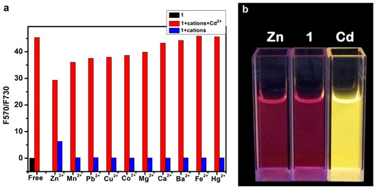 (a) Fluorescence intensity ratio (F570/F730) measured for sensor 1 in acetonitrile (2 μM) in the absence of metal ions (black), and in the presence of various metal ions (2 μM), (blue), followed by addition of 2 μM Cd2+ into each of the eleven solutions (red); (b) Photographs taken for the 2 μM solution of 1, in comparison to the ones containing 2 μM of Zn2+ and Cd2+.