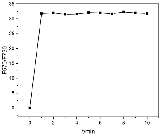 The sensor 1 could rapidly detect Cd2+ ion, as shown in Figure 6. When we put 2 μM Cd2+ into 2 μM sensor 1 solution, the fluorescence intensity ratio (F570/F730) of sensor 1 quickly increased and reached a stable value within 1 min. This is a good trait for fast and real-time determination.