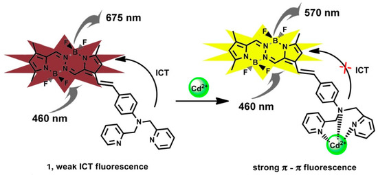 We noticed that there have been only two BOPHY fluorescent sensors reported so far, which were used for detecting Cu2+ and H+, respectively [37,38]. In this paper, we report on synthesis of a novel fluorescent sensor 1 for Cd2+ (Scheme 1) based on a BOPHY fluorophore substituted by tetramethyl group (Me4BOPHY), in conjugation through a vinyl link with an electron donor moiety N,N-bis(pyridin-2-ylmethyl)benzenamine (BPA). BPA is also a strong chelator to Cd2+ ion, thus affording high sensing sensitivity. Pristine sensor 1 exhibits a significant internal charge transfer (ICT) transition between Me4BOPHY and BPA, with an absorption and fluorescence extending into long wavelength, 550 nm and 675 nm, respectively. When chelated with Cd2+ the electron-donating power of BPA will be reduced, thus quenching the ICT transition and turning on the π − π transition of the fluorophore, which combined the results in blue-shift of the absorption and fluorescence of 1. Such dramatic spectral change can be used to develop efficient fluorescence sensor for Cd2+ detection, particularly through the ratiometric fluorescence modulation [39,40,41,42,43].