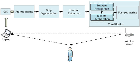 The framework of Wii is provided in Figure 1; it has four main components: pre-processing, step segmentation, feature extraction and classification. In the classification procedure, it contains stranger recognition and identity identification before post-processing. Noise removing is conducted in preprocessing as there are more than one kind of noise included in the wireless signal. Step segmentation process can divide continuous CSI data into discrete segments according to walking steps in order to extract per-step features. In feature extraction module, several time and frequency domain features are extracted and the features that generate the largest information gain are selected. Finally, stranger is recognized and identity is identified in classification module.
