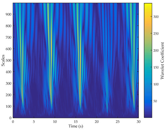 First, we calculate the wavelet coefficients of the first PCA component of the CSI waveform after low-pass filtering (cpl) in multiple scales using CWT. According to our experimental results of trying different wavelet functions, we choose DB6 (Daubechies) wavelet [32]. As shown in Figure 2, we can see clearly the periodicity of the wavelet coefficients exists under some scales. However, the exact periodicity cannot be confirmed intuitively from the wavelet coefficients. The wavelet variance reflects the distribution of the power of the wavelet coefficients in different scales, and it can be used to estimate the main periodicity of a time series [33]. Thus, we then calculate the wavelet variance as Equation (5).