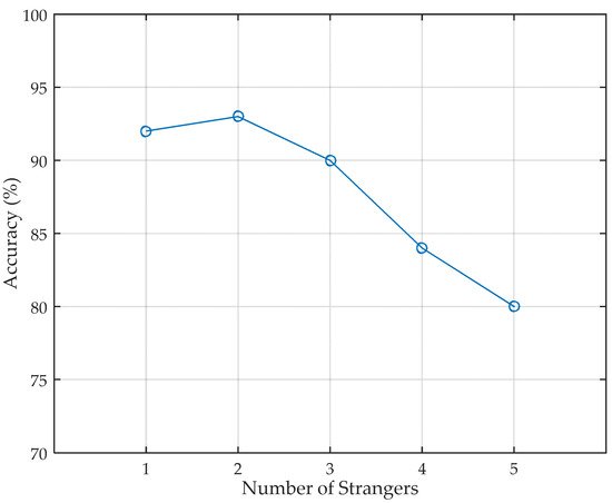Stranger recognition is the first step of human identification in security system, so it is a crucial procedure of Wii. Before identifying the person’s identity, Wii has to recognize whether the person entering the monitoring area is an authenticated person or a stranger. After only five walking steps, Wii can determine whether the person is a stranger. When an authenticated person is recognized, the identity identification procedure is activated. The accuracy of stranger recognition under different number of strangers in the training set is shown in Figure 7. The strangers are randomly selected from the volunteers and modeled using the same features as the authenticated people. The selection is performed several times and the final result is the average accuracy of different combination. As can be seen, the overall trend of the accuracy decreases as the number of strangers in the training set becomes larger. This is because, as the number of strangers in the training set increases, the features of strangers become more and more generally representative that the features of authenticated people may be submerged in those of strangers. Consequently, the number of strangers in the training set should not be too large.