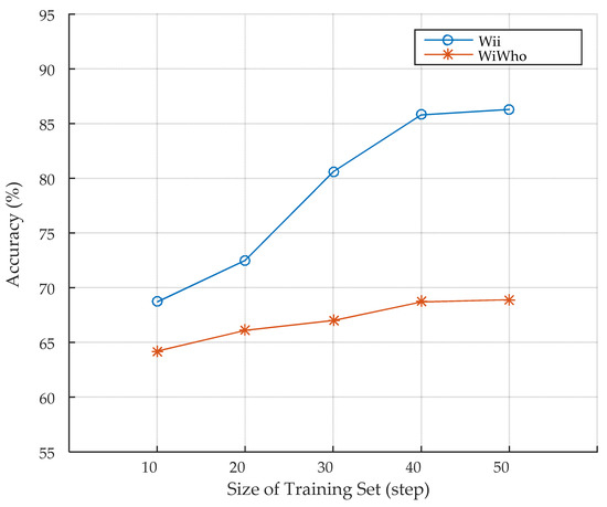Step segmentation is a critical module of gait analysis in the system. To validate its effectiveness, we compare Wii with WiWho fairly using the same features and classifier as that of WiWho as well as the experimental setup. Concretely, the features include the feature ID of 1, 2, 5, 8, and 11 in Table 1 and the classifier is decision tree. There are eight volunteers in the training set. The size of the training set varies from 10 to 50 steps. The size of walking window is five steps. The identification accuracy of the two approaches is shown in Figure 8. It can be seen that the identification accuracy of both approaches rises as the size of training set grows. The accuracy of Wii grows faster and keeps higher than that of WiWho as the size of training set becomes larger. It indicates that the step segmentation module of Wii can extract more effective step information and has a better performance.