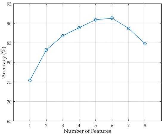The number of features has impact on both the computation complexity and the identification accuracy. We select the first n features that have the highest information gain, and eight volunteers are included in this evaluation. The evaluation result is depicted in Figure 9. The identification accuracy first rises with the number of features. However, the accuracy is not changing monotonically with the number of features. It starts to decrease when the number of features becomes larger than 6 because an excess number of features leads to overfitting to the system. As a result, the five features with the highest information gain give a good trade-off between computation complexity and accuracy.