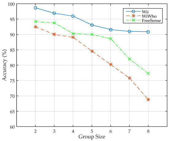 As shown in Figure 12, the accuracy of Wii decreases from 98.7% to 90.9% as the group size gets larger. It is because there are similar features among different people, and when the group size gets larger, the similar features add more confusion into the system, which makes it more difficult to identify a person. The same trend also happens in WiWho and FreeSense, but the accuracy decreases quickly when the group size gets larger than 4. Consequently, the comparison result indicates that Wii performs more stably when the group size gets larger.