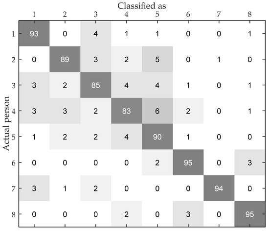 The identification result of the eight volunteers in the above experiment is shown in the confusion matrix in Figure 13. It shows the details of the identification of different people. It is obvious that different people have different identification accuracy and it varies from 83% to 95%. According to Table 2, the result that Volunteer 6 and 8 have the highest accuracy as these two volunteers are the only female volunteers in the test group, which indicates that the gait pattern of female has less similarity with male. We can also find that, if two people have similar height and weight, they are more likely to have difficulties being correctly identified. Especially, the identification accuracy of Volunteer 7 is the highest among the male volunteers, as he has a higher height than the other male volunteers. In other words, height and weight have a significant impact on the transmission of wireless signal.