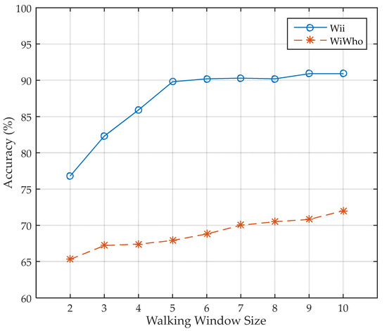 As can be seen in Figure 14, we change the size of walking window from 2 to 10. The smallest window size is 2 is because it is the smallest size larger than a single step. If the window size decreases to 1, the walking features decline to per-step features, which makes no sense. We think it is still practical for the system that the identification result comes out after the user walks for 10 steps if we can get a higher accuracy. From the evaluation result we can see that, when the size of the walking window is smaller than five steps, the identification accuracy of Wii keeps growing as the window size gets larger, which indicates that our walking features play a crucial role in improving the performance of identity identification. However, the accuracy becomes stable when the window size gets larger than five steps, which means that it is appropriate to set the size of walking window to 5. The accuracy of 90.9% can satisfy common smart home applications. Obviously, Wii can be better adopted in a larger group size.