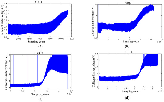Experimental data. (a) IGBT1 expermental raw data; (b) IGBT2 expermental raw data; (c) IGBT3 expermental raw data; (d) IGBT4 expermental raw data.