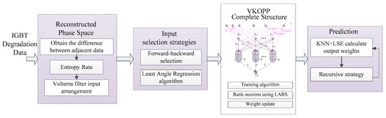 In [21], the author noted that the Volterra series and single-hidden layer feed forward neural network (SLFN) model are inherently in contact and similar in function, structure and method for solving, in the case of the reconstructed phase space vector as the input vector of the SLFN model. In addition, the original extreme learning machine (ELM) algorithm [17], which uses SLFN with very few steps and very low computational cost, has all the properties of SLFN. In addition, the OPELM inherits the characteristics of ELM and wraps this extended algorithm possessing higher generalization and robustness. Thus, the Volterra series and OPELM model are inherently equivalent. Owing to the equivalency of both models, in this paper we propose a novel prediction model named Volterra k-nearest neighbor adaptive OPELM prediction (VKOPP) model to trace the IGBT’s degradation and estimate its RUL with the superiority of both methods.