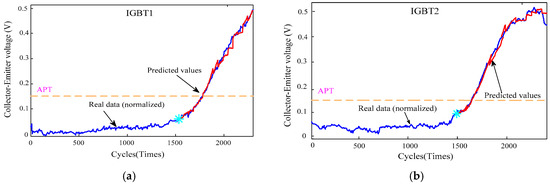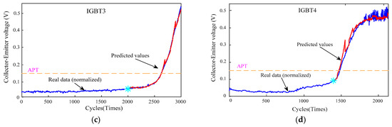 Figure 8 (blue line) shows the saturation voltage decrease VCE fade trends with four groups of experiments labeled IGBT1, IGBT2, IGBT3 and IGBT4 from the above temperature cycling test, where APT stands for the acceptable performance threshold. For many applications, when the measured VCE deviates ±15% fromits “normal” reference value, this IGBT is considered as seriously “degraded” and should be replaced [28]. Therefore, the value of APT in our paper is 0.15, which is 15% of the rated value.