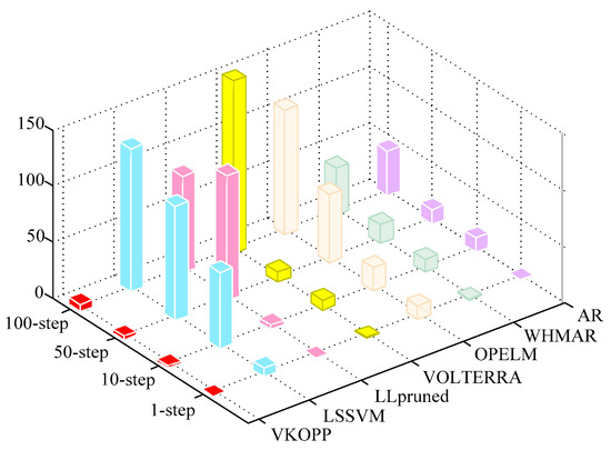 From Table 4, it can be seen that the prediction accuracy of the proposed VKOPP method improved at least one or two orders of magnitude better than the original OPELM and Volterra. Specifically, compared with the strong stochastic Laser, DMT, ED, CATS_B, SN, and RDD sequence, the VKOPP model has better adaptability and thus achieves higher prediction performance. Furthermore, the VKOPP model is always better than, or at least as good as, the other prediction models, with an improvement in the MSE and NRMSE of the results. Obviously, the one-step prediction performance of the VKOPP model is satisfactory for application.