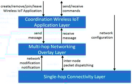 Finally, the Coordination Wireless IoT Application Layer provides tools to simplify the development of sensor and controller nodes. This layer hides the complexity of node coordination, such as by enabling the transparent dispatching of commands and updated software components (additional insights in Section 6 and Section 7 respectively) among sensors and coordinators related to the same Wireless IoT Application. At the same time, it supports the tuning of packet management to achieve a proper tradeoff among packet delivery probabilities and cost of packet management. For instance, when sending a message, sensor nodes can specify a proper expiry value after which messages should be discarded even if not yet correctly delivered to the destination by the Multi-hop Networking Overlay Layer. From an architectural point of view, it exploits primitives provided by the layer below to support the dispatching of messages with end-to-end visibility by adopting four different semantics: