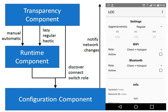 Link Connectivity Component (LCC) architecture (left) and Android GUI (right).