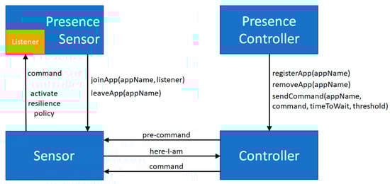 Pre-command, here-I-am and command messages are dispatched taking advantage of the Multi-hop Networking Overlay Layer, thus transparently achieving multi-hop and opportunistic networking capabilities. As better detailed in Section 8, PresenceSensor and PresenceController components take advantage of the Sensor and Controller ones respectively to transparently register, look for, and join controller nodes, send and receive commands, and notify resilience policy activations in an event-driven fashion.