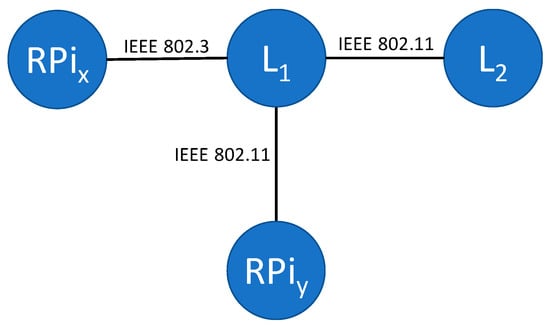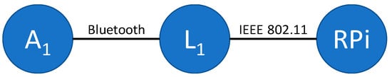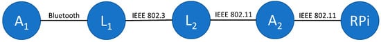 First of all, we have tested the two-hop environment in Figure 5, formed by a Bluetooth hop between an android device (A1) and a laptop (L1) and a IEEE 802.11 hop between L1 and a Raspberry Pi 3 (RPi), performing the following steps:
