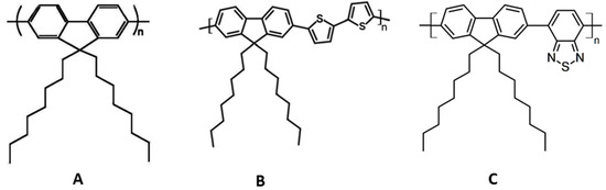 Structures of the CPs used: (A) poly[9,9-dioctylfluorene-2,7-diyl] (PFO); (B) poly[(9,9-dioctylfluorenyl-2,7-diyl)-co-bithiophene] (F8T2); and (C) poly[(9,9-dioctylfluorenyl-2,7-diyl)-alt-co-(1,4-benzo-2,10,3- thiadiazole)] (F8BT).