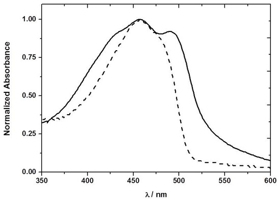 The ground-state absorption spectrum of F8T2 was obtained in toluene solution and in ethyl cellulose films (Figure 3). In the case of the thin film a new band is observed at longer wavelengths (492 nm). A number of possible explanations exist for this new band. However, detailed analysis suggests that it is associated with the so-called β phase of the F8T2 [15]. The β phase is a metastable state with part of the CP in a rigid extended structure, and can be formed through evaporation of an appropriate solvent, by treatment of the film or one of the other phases by solvent vapor, or by keeping the polymer in a restricted environment. The β-phase peak was observed originally by Bradley and co-workers [16] in PFO polystyrene films and PFO solutions in poor solvents (such as methylcyclohexane) [17]. We observed this new band at 492 nm in the absorption spectrum of the PFO ethyl cellulose films (Figure 4), even though F8T2 is a less rigid polymer than PFO, strong support has been presented from steady-state and time-resolved fluorescence and fluorescence anisotropy measurements for the formation of the β-phase with this polymer [18].