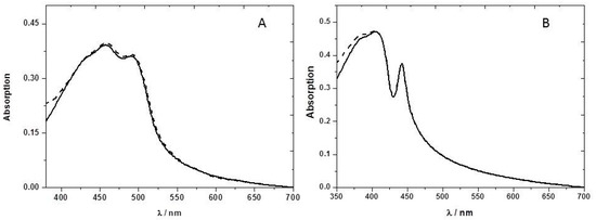 (A) Absorption spectra of the F8T2 film in the presence (dashed line) and absence (solid line) of nitrobenzene vapor; (B) Absorption spectra of the PFO film in the presence (dashed line) and absence (solid line) of nitrobenzene vapor. Both CPs are incorporated in an ethyl cellulose matrix.