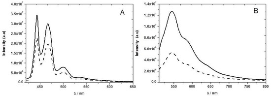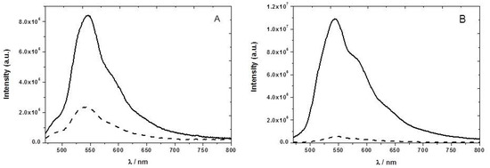 Fluorescence spectra in the absence (solid line) and presence of saturated NB vapors at room temperature (dashed line) of: (A) PFO in ethyl cellulose film, λexc = 410 nm, and (B) F8T2 in ethyl cellulose film, λexc = 490 nm.