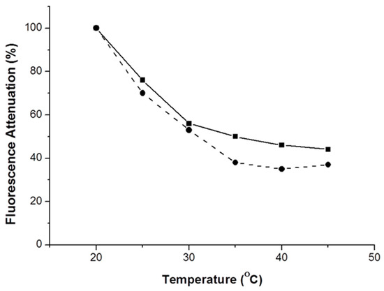 Fluorescence attenuation of the F8T2 ethyl cellulose film with 1% (w/w) of PEG 3400 in the absence (solid line) and presence (dashed line) of DNB vapor with as a function of the temperature. Excitation wavelength was 450 nm.