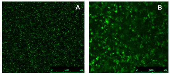 Typical images of (A) PFO and (B) F8T2 in neat ethyl cellulose film, observed by confocal microscopy. Excitation wavelength was 458 nm and emission wavelength in the range of 510–700 nm. These pictures have 512 × 512 pixels, using a pinhole of 1 AU, zoom 4×, and 400 Hz. The scale bars are 25 μm.