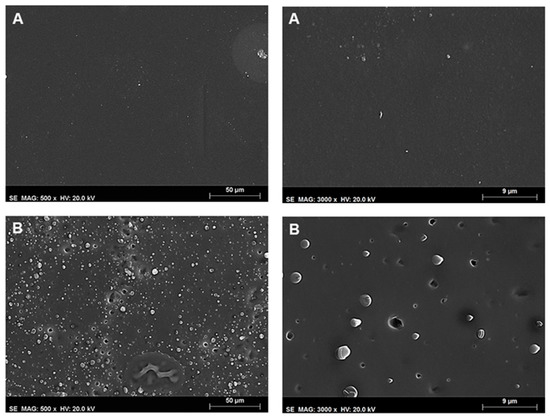 SEM images of ethyl cellulose films containing (A) F8T2 and (B) F8T2 and 1% PEG 600. The scale bars are 50 μm and 9 μm.